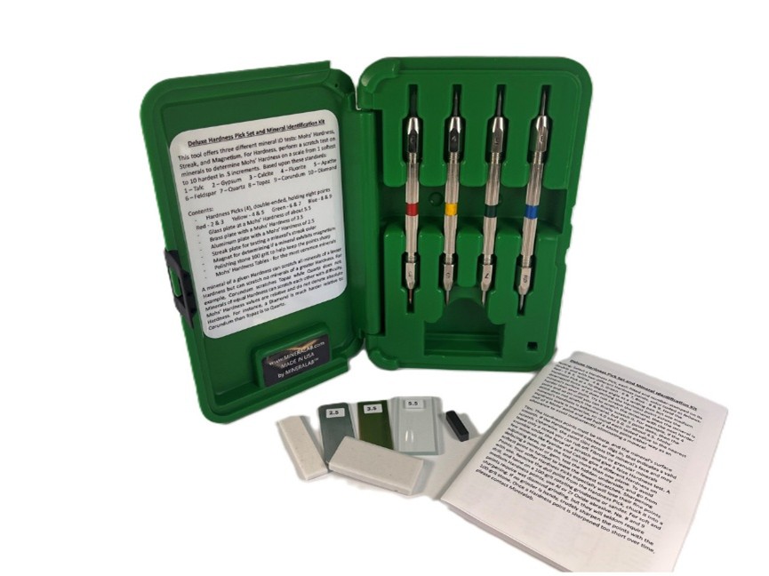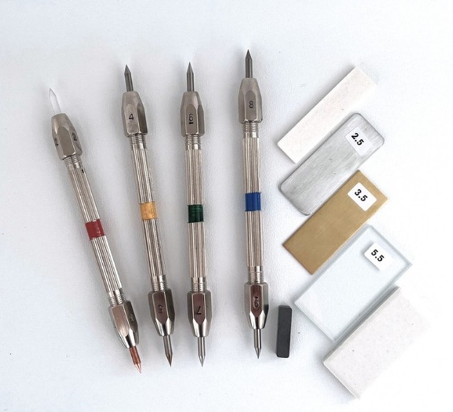 | El set de rayadores de dureza para Mineralab ID es único porque, a diferencia de otras herramientas de prueba de dureza que utilizan puntas de minerales o cristales para la prueba de rayado, las púas de Mineralab están hechas de metales y aleaciones con valores de dureza de 2 a 9 en la escala de dureza de Mohs. Además, al ser de metal, se afilan fácilmente hasta obtener puntas afiladas que no se rompen y son fáciles de afilar.